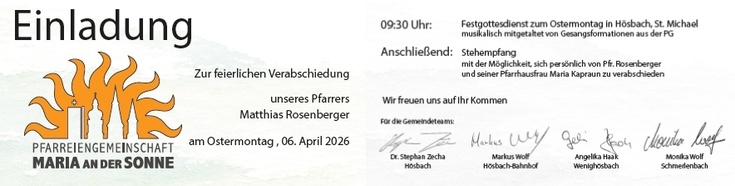 Jetzt im Frühjahr des neuen Jahres steht „das Scheiden“ an,das Abschiednehmen am kommenden Ostermontag von der Pfarreiengemeinschaft „Maria an der Sonne“ und von der Gemeinde Hösbach, die mir 8 Jahre lang Lebensmittelpunkt und Wirkungsstätte waren.